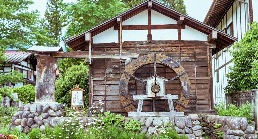 宿場通りの合間にある昔ながらの水車。今でも須川堰のそばでのどかに回り続け、たくみの里のシンボルとしても知られています。